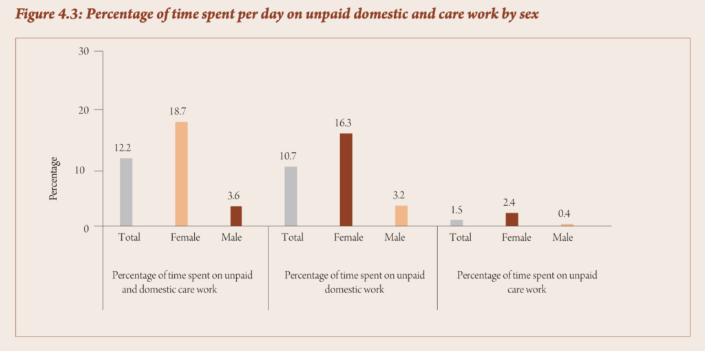 Nationally, women spent about seven times more time on unpaid care work (2.4%) than men (0.4%), and five times more (16.3%) on unpaid domestic work than their male counterparts (3.2%).
