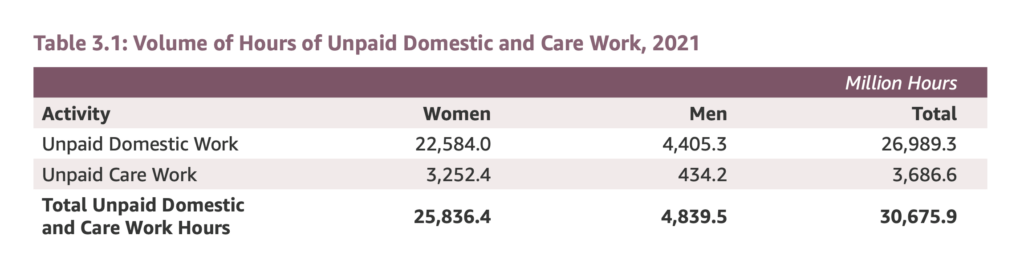 The report found that women spent 25.8 billion hours on unpaid domestic and care work, compared to men’s 4.8 billion hours.